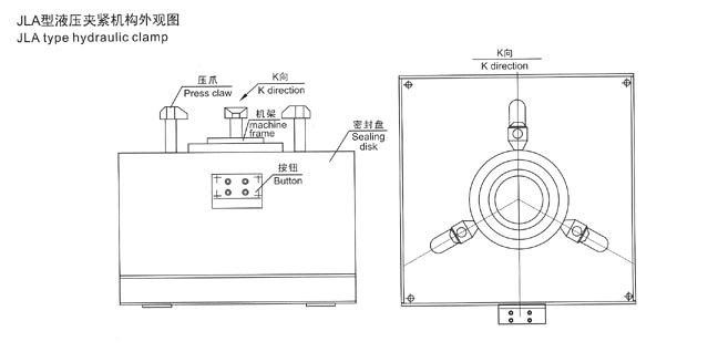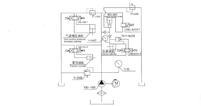 本機(jī)由液壓系統(tǒng)、機(jī)械部件,電器控制及多極氣源升壓裝置系統(tǒng)等部件組成。液壓系統(tǒng)是本試驗(yàn)臺(tái)的動(dòng)力主源。用于各類液壓缸和機(jī)械件驅(qū)動(dòng)執(zhí)行功能。試驗(yàn)面夾爪由液壓缸直接驅(qū)動(dòng)執(zhí)行,軸向夾緊壓力是按閥門試驗(yàn)壓力等級(jí)不同進(jìn)行調(diào)節(jié)增壓(最高液壓增壓壓力31 5MPa)。各夾爪受力均,夾緊可靠。徑向移動(dòng)由液壓缸傳動(dòng)執(zhí)行,各夾爪進(jìn)退同步,靈活自如,確保通徑大小不同閥門的測(cè)試。多極氣源升壓裝置是利用液氣聯(lián)動(dòng)增壓。增壓范圍0.6—32 0MPa,用于閥門介質(zhì)壓力試驗(yàn)。氣源升壓工作設(shè)有自動(dòng)和手控二種操作選擇,當(dāng)選用自動(dòng)升壓工作時(shí),工作人員可以近距離離開操縱臺(tái)觀察現(xiàn)場(chǎng)試驗(yàn)情況。