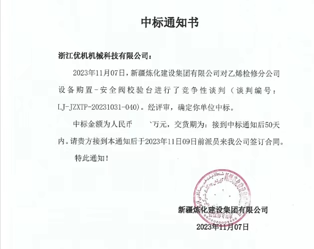 近期,浙江優(yōu)機(jī)機(jī)械科技有限公司收到中標(biāo)通知書,中石油新疆煉化建設(shè)集團(tuán)閥門試驗(yàn)校驗(yàn)項(xiàng)目,三次添加設(shè)備購置項(xiàng)目-安全閥校驗(yàn)臺(tái),經(jīng)評(píng)審確定中標(biāo)(談判文件編號(hào):LJ-JZXTP-20231031-040),合計(jì)三期閥門檢測校驗(yàn)設(shè)備總數(shù)達(dá)到12臺(tái)(套)金額叁佰多萬,該項(xiàng)目是浙江優(yōu)機(jī)機(jī)械科技有限公司主營產(chǎn)品閥門檢測校驗(yàn)設(shè)備進(jìn)入中石油系統(tǒng)樣本項(xiàng)目。